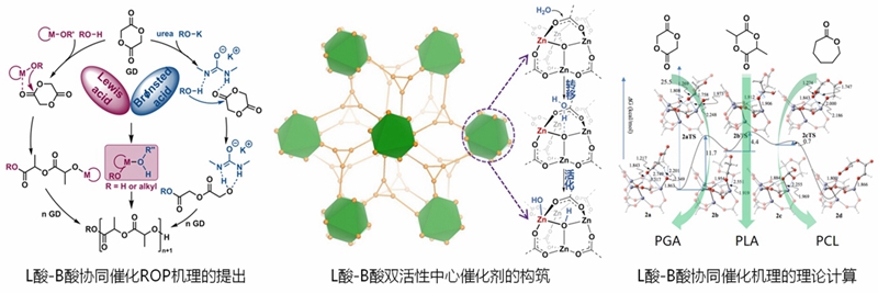 近日,我校石油化工學(xué)院陳群研究員課題組在新型醫(yī)用可降解聚酯材料及產(chǎn)業(yè)化關(guān)鍵技術(shù)研發(fā)過程中,創(chuàng)新性提出了布朗斯特酸和路易斯酸協(xié)同催化環(huán)脂開環(huán)聚合機(jī)理,為無毒、高效聚合催化劑的設(shè)計(jì)開發(fā)奠定了基礎(chǔ)。該工作以金屬-有機(jī)自組裝為策略,構(gòu)筑了生物相容性金屬-有機(jī)框架材料,實(shí)現(xiàn)了高效催化環(huán)脂本體開環(huán)聚合。通過理論計(jì)算并結(jié)合原位漫反射傅立葉變換紅外光譜和基質(zhì)輔助激光解吸電離飛行時(shí)間質(zhì)譜等多種驗(yàn)證手段,提出并驗(yàn)證了基于布朗斯特酸和路易斯酸協(xié)同催化的環(huán)脂開環(huán)聚合機(jī)理,為開環(huán)聚合反應(yīng)提供了新思路。研發(fā)出的新催化劑不僅符合無毒、高穩(wěn)定和受控開環(huán)聚合的要求,形成的聚酯端羥基便于改性,具有重要的應(yīng)用價(jià)值,成果發(fā)表在化學(xué)頂級(jí)期刊《Chemical Science》最新一期上,并獲中國發(fā)明專利授權(quán)(專利號(hào)ZL201510483737.8)。