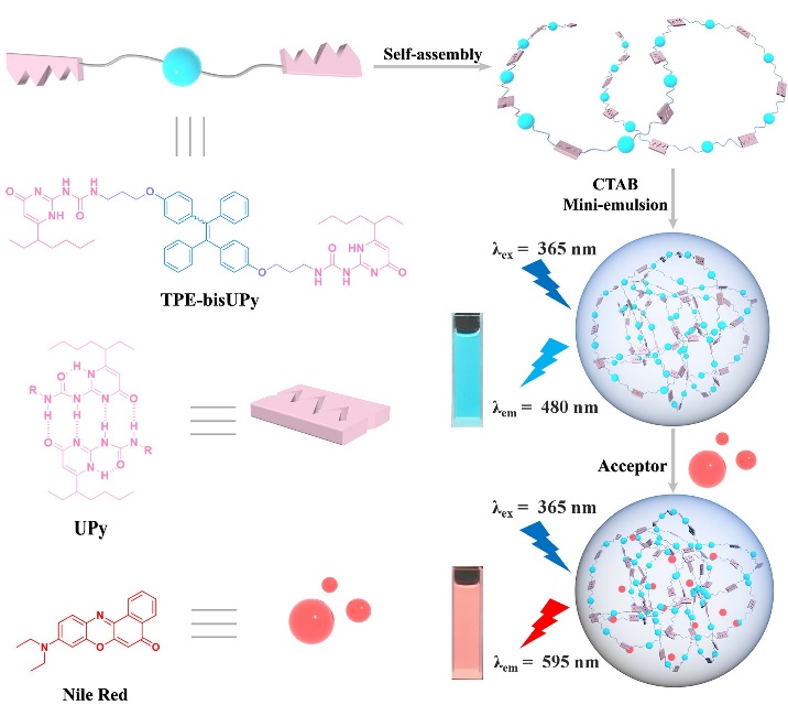 近日,我院孫小強(qiáng)/王樂(lè)勇聯(lián)合團(tuán)隊(duì)青年教師肖唐鑫博士在Chemical Communications上發(fā)表研究論文(DOI: 10.1039/D0CC05077F)。光合作用是自然界的普遍現(xiàn)象,是一切生命的基礎(chǔ)。模擬光合作用的光能捕獲和能量轉(zhuǎn)移過(guò)程具有重大意義。本論文利用TPE基團(tuán)橋連的雙UPy化合物作為天線(xiàn)分子和給體,通過(guò)四重氫鍵形成超分子聚合物,并進(jìn)一步在水溶液中通過(guò)微乳化組裝成超分子納米顆粒,并負(fù)載NiR染料作為能量受體,構(gòu)筑了一個(gè)基于水相的超分子光捕獲體系,并展現(xiàn)出高效的能量轉(zhuǎn)移效率和天線(xiàn)效應(yīng)以及顏色可調(diào)的發(fā)光功能。