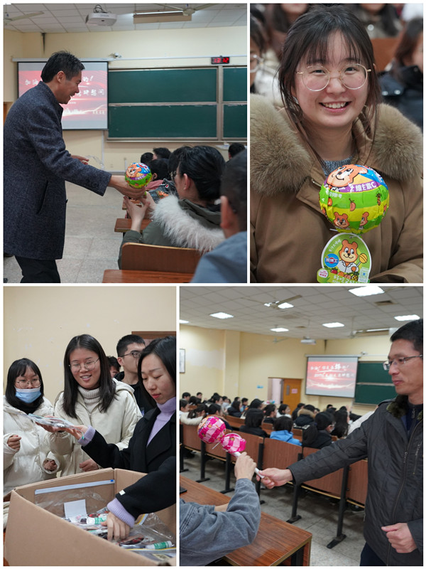 首先,陳海群對正在備戰(zhàn)考研的學(xué)子們表達(dá)了慰問、鼓勵、期望之情:希望同學(xué)們保持樂觀的心態(tài)、注意身體健康、明確考研目標(biāo)、積極備戰(zhàn)考研。接著,吳荷平叮囑大家平衡好考研壓力,把生活、學(xué)習(xí)規(guī)律調(diào)整到位,全力沖刺,發(fā)揮出自己最好的水平。而后,繆老師通過“青春是用來拼搏的,夢想是用來實(shí)現(xiàn)的,圓夢考研你們是最棒的!”來鼓勵大家考研加油。院領(lǐng)導(dǎo)表示學(xué)院是所有考研同學(xué)的堅強(qiáng)后盾,會努力為大家提供良好的考研條件,并祝愿大家金榜題名,考上理想院校。最后,學(xué)院還為考研學(xué)子們發(fā)放了“最棒”棒棒糖、“考霸”文具袋,希望同學(xué)們堅定信念,全力沖刺,蟾宮折桂,舍我其誰!
