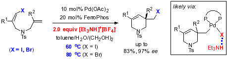 該課題組把這種研究策略稱之為氫鍵作用促進的還原消除,該策略確保常規(guī)的手性FerroPhos膦配體就能實現(xiàn)優(yōu)秀的不對稱烯烴碳碘化反應(yīng),同時第一次實現(xiàn)了不對稱烯烴碳溴化反應(yīng)。通過實驗和理論計算研究,首次清晰的描繪了烷基鹵代烴還原消除反應(yīng)的整個歷程,修正了僅受熱力學控制的傳統(tǒng)認知,加深了對該基元反應(yīng)的理解。其中的氫鍵策略相信能促進和推動該基元反應(yīng)在有機合成的應(yīng)用。