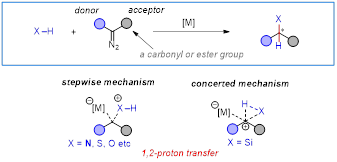 不對(duì)稱金屬卡賓插入X-H鍵反應(yīng)是構(gòu)建手性C-X常用的方法。一般來說,此類反應(yīng)對(duì)底物有較多限制,比如卡賓前體是既有給電子基團(tuán)也有吸電子基團(tuán),而吸電子基團(tuán)如羧酸酯的存在來穩(wěn)定卡賓中間體使反應(yīng)得以順利實(shí)現(xiàn)。反應(yīng)機(jī)理也大多以1,2-質(zhì)子遷移為主。