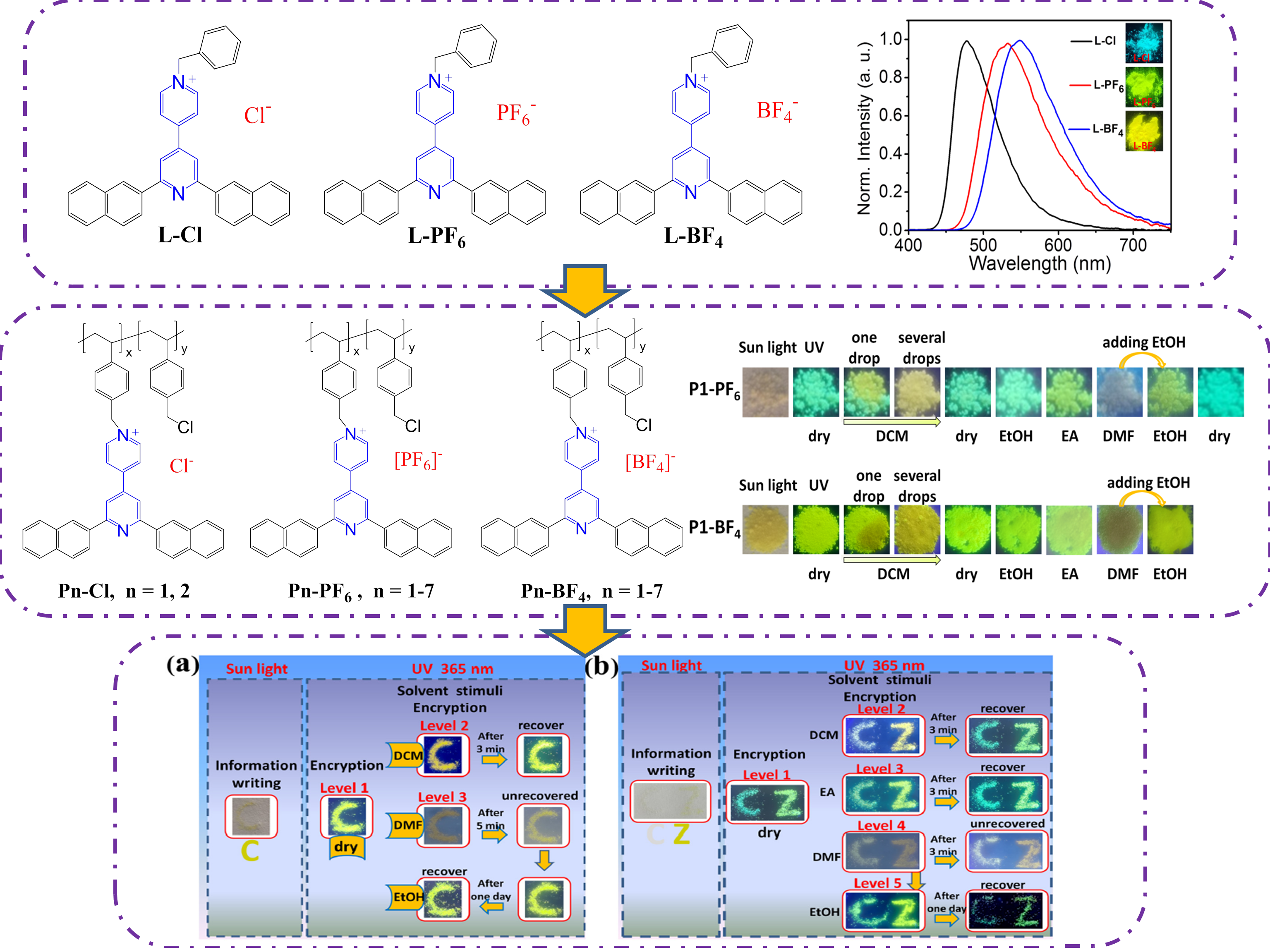 智能熒光材料,在外界刺激調(diào)節(jié)作用下,可呈現(xiàn)多種不同發(fā)光顏色,或是不同強(qiáng)度的發(fā)光,在高級光學(xué)防偽領(lǐng)域具有巨大應(yīng)用潛能,吸引了大量研究者廣泛研究。目前,盡管有一些新穎的多色可調(diào)光學(xué)材料,如無機(jī)材料,量子點,金屬有機(jī)框架聚合物,高分子聚合物等,被相繼開發(fā)應(yīng)用。但是,所報道的很大部分相關(guān)多色發(fā)光材料,合成較復(fù)雜,光學(xué)可逆性差,往往僅呈現(xiàn)兩種可調(diào)的發(fā)光顏色,在高階光學(xué)防偽實際應(yīng)用方面仍有一定局限。為實現(xiàn)高階光學(xué)防偽的實際應(yīng)用,仍需進(jìn)一步發(fā)展簡單的兼具高效發(fā)光、高對比度、優(yōu)異可逆性、多色發(fā)光(超過三種發(fā)光顏色)的動態(tài)智能發(fā)光材料,但這極具挑戰(zhàn)性。