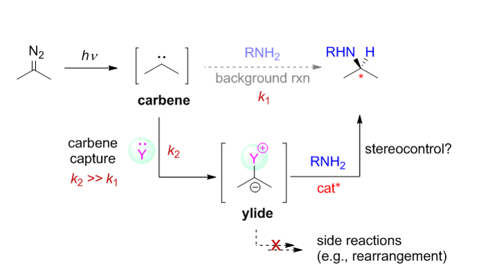 解決方案:如何抑制背景反應(yīng)以提高有機(jī)催化的自由卡賓轉(zhuǎn)移反應(yīng)的立體選擇性,是該研究體系所面臨的最重要的科學(xué)問題與挑戰(zhàn)?;谖覀冋n題組在有機(jī)催化的卡賓類似物(硫葉立德)N-H插入反應(yīng)的研究興趣,我們首先研究了有機(jī)催化的可見光介導(dǎo)條件下的自由卡賓不對(duì)稱N-H插入反應(yīng),通過適當(dāng)?shù)姆磻?yīng)條件優(yōu)化,我們發(fā)現(xiàn)在手性磷酸催化劑存在下,反應(yīng)最高只能獲得具有中等的立體選擇性的N-H插入產(chǎn)物?;诖饲捌谘芯拷Y(jié)果,我們?cè)O(shè)想能否通過自由卡賓的間接捕獲思路,即利用含孤對(duì)電子的化合物作為添加劑捕獲可見光激發(fā)產(chǎn)生的自由卡賓而原位形成新的葉立德中間體,該葉立德中間體需順利參與手性酸催化的不對(duì)稱N-H插入反應(yīng),從而提高反應(yīng)的立體選擇性(思路見下圖)。但此思路中,各步反應(yīng)速率的匹配性以及添加劑與催化反應(yīng)體系的兼容性是需要額外考慮的問題。