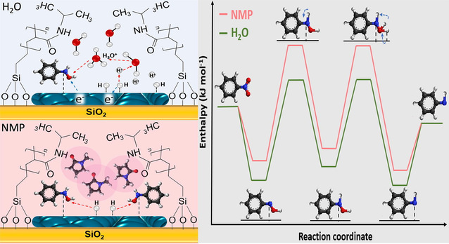 在前期研究聚合物對(duì)催化劑誘導(dǎo)的溶劑化效應(yīng)的基礎(chǔ)上(ACS Catalysis 2023, 13, 10, 6590–6602,Top期刊,封面論文),中文解析見(jiàn):https://mp.weixin.qq.com/s/6ZsBwg6RtE0h1wOAPhf3_w,黃鵬程博士與荷蘭特文特大學(xué)(University of Twente)Leon Lefferts, Jimmy Faria Albanese 教授合作,研究了液相加氫反應(yīng)中溶劑(質(zhì)子溶劑與非質(zhì)子溶劑)對(duì)于修飾催化劑表面的聚合物的刺激響應(yīng)性的影響,以及對(duì)于硝基苯加氫反應(yīng)的反應(yīng)速率,反應(yīng)活化能,過(guò)渡態(tài)能量的影響。