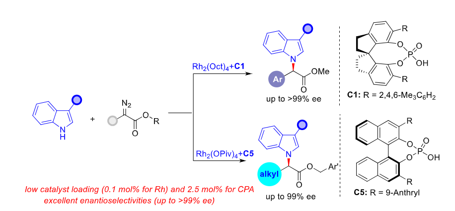 本課題組用0.1mol%的銠催化劑和2.5mol%的手性膦酸,高效的實現(xiàn)了吲哚的不對稱N-H鍵插入反應(yīng)。用芳基重氮和烷基重氮作為親電試劑前體,通過銠催化劑和膦酸的篩選,首次實現(xiàn)了芳基重氮和烷基重氮羧酸酯的高對應(yīng)選擇性N-H鍵插入反應(yīng)。反應(yīng)具有很好的底物實用性,高效的催化活性。產(chǎn)物的ee值最高>99%。