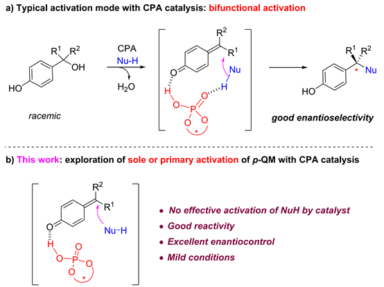對亞甲基醌(p-QM)的手性轉化在不對稱合成領域已經(jīng)成為一種非常具有吸引力的手段,近年來引起了廣泛關注。這得益于其遠程1,6-加成后快速構建四級碳手性中心的特性。在過去手性磷酸參與的p-QM轉化中,值得注意的是,手性磷酸往往都需要發(fā)揮其雙功能催化劑的作用,不僅要活化p-QM的羰基位置,同時也需要與親核試劑(如吡咯、吲哚、萘酚)之間通過氫鍵作用來進一步幫助手性識別。在這一活化模型當中,親核試劑與手性磷酸之間的氫鍵作用不僅可以幫助穩(wěn)定對映選擇性的過渡態(tài),也可以增強親核試劑的親核性,因此,具有良好氫鍵給體的親核試劑極為重要。這在諸多文章中的控制實驗都有明顯體現(xiàn),當親核試劑上的作用位點被屏蔽后,反應結果往往大幅下降(ee值或產(chǎn)率)。迄今為止,在手性磷酸催化的p-QM化學中采用無明顯作用位點的親核試劑實現(xiàn)高效的對映選擇性轉化還沒有相關報道。孫建偉和黃海課題組首次采用N甲基保護的吲哚作為親核試劑,實現(xiàn)了一系列新型的吲哚基手性四芳基甲烷球形分子(Chem. Sci.2023, DOI: 10.1039/D3SC05014A)。在反應優(yōu)化過程中,通過調節(jié)手性磷酸的結構,采用具有大位阻邊臂的手性磷酸BINOL-2,6-2iPr-4-Ad-Ph成功實現(xiàn)了無明顯氫鍵作用位點的親核試劑在p-QM化學中的高對映選擇性轉化。本文第一作者是常州大學青年教師韓政宇副教授。本項工作也是孫建偉和黃海課題組在手性多芳基甲烷研究領域又一重要的延續(xù)工作(1. Org. Lett. 2023, 25, 8478–8483; 2. Chem. Synth. 2023, 3, 32; 3. Org. Lett. 2023, 25, 477-482; 4. Org. Lett., 2022, 24, 4246-4251; 5. Chem. Commun., 2022, 58, 7128-7131.)。