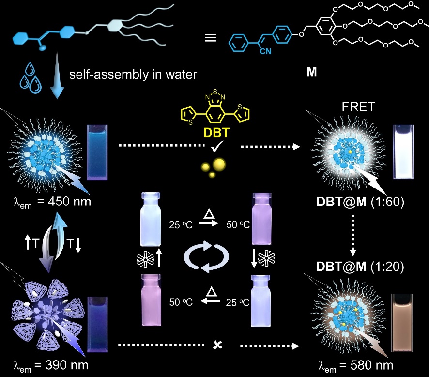 在前期的研究中,課題組開發(fā)了若干人工超分子光捕獲系統(tǒng)(J. Mater. Chem. A2022, 10, 8528-8534. Chem. Commun., 2022, 58, 2343-2346.)和溫度響應(yīng)有機(jī)熒光材料(Chem. –Eur. J.2023, 29, e202203463. Chin. Chem. Lett., 2023, 34, 108617.)。在這些工作究的基礎(chǔ)上,同時(shí)基于自然界光合作用受溫度影響的啟發(fā),課題組近期在水相中又構(gòu)筑了一種具有可調(diào)白光發(fā)射的溫度響應(yīng)型人工光捕獲系統(tǒng),相關(guān)工作以“A temperature-responsive artificial light-harvesting system in water with tunable white-light emission”為題發(fā)表在國(guó)際材料化學(xué)權(quán)威雜志Journal of Materials Chemistry A上(J. Mater. Chem. A, 2023, 11, 18419-18425. IF: 11.9)。