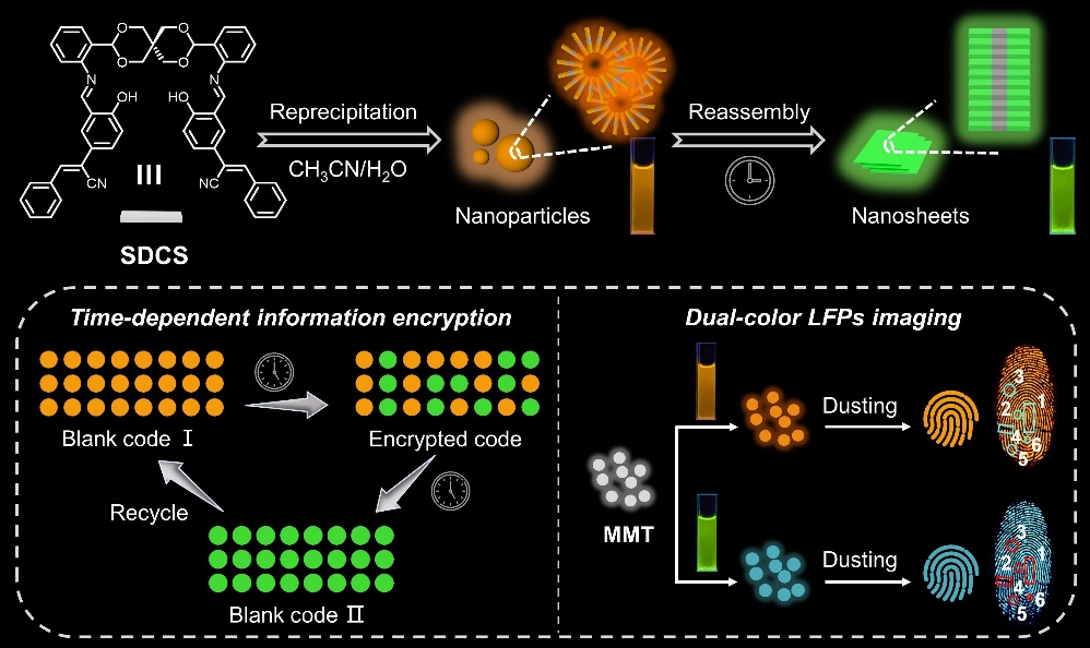 具有隨時(shí)間變化發(fā)光顏色的有機(jī)發(fā)光材料在化學(xué)傳感、高分辨率生物成像和高安全性信息加密等領(lǐng)域顯示出廣闊的應(yīng)用前景。基于此,研究組開發(fā)了一種橋連的氰基苯乙烯衍生物SDCS作為CH3CN/H2O混合溶劑中的單一組分的時(shí)間依賴熒光系統(tǒng)。具體來說,通過再沉淀法從SDCS制備的原始橙色發(fā)光納米顆??梢栽诔肿幼越M裝的驅(qū)動(dòng)下隨著時(shí)間的推移轉(zhuǎn)變?yōu)榫G色發(fā)光納米片。值得注意的是,這種轉(zhuǎn)化速率可以通過調(diào)整含水量來控制?;谶@些獨(dú)特的屬性,時(shí)變熒光二進(jìn)制碼被開發(fā)出來,從而實(shí)現(xiàn)了具有更高安全性的時(shí)間依賴信息加密。此外,SDCS的雙色發(fā)光可以通過固體基質(zhì)來獨(dú)立固定,如被固定在水凝膠或粉末中。其中被固定在蒙脫土中所得的發(fā)光粉末成功地用于潛指紋的雙色熒光成像。這項(xiàng)工作展示了利用超分子策略控制單組分系統(tǒng)中的多重發(fā)射性質(zhì)并賦予其多功能應(yīng)用。相關(guān)工作以“Dynamic Time-Dependent Emission in Solution and Stable Dual Emission in Solid Matrix Exhibited by a Single-Component Fluorescence System”為題發(fā)表在國(guó)際材料科學(xué)權(quán)威雜志Advanced Functional Materials上(Adv. Funct. Mater.2024, doi: 10.1002/adfm.202314093. IF: 19.0)。