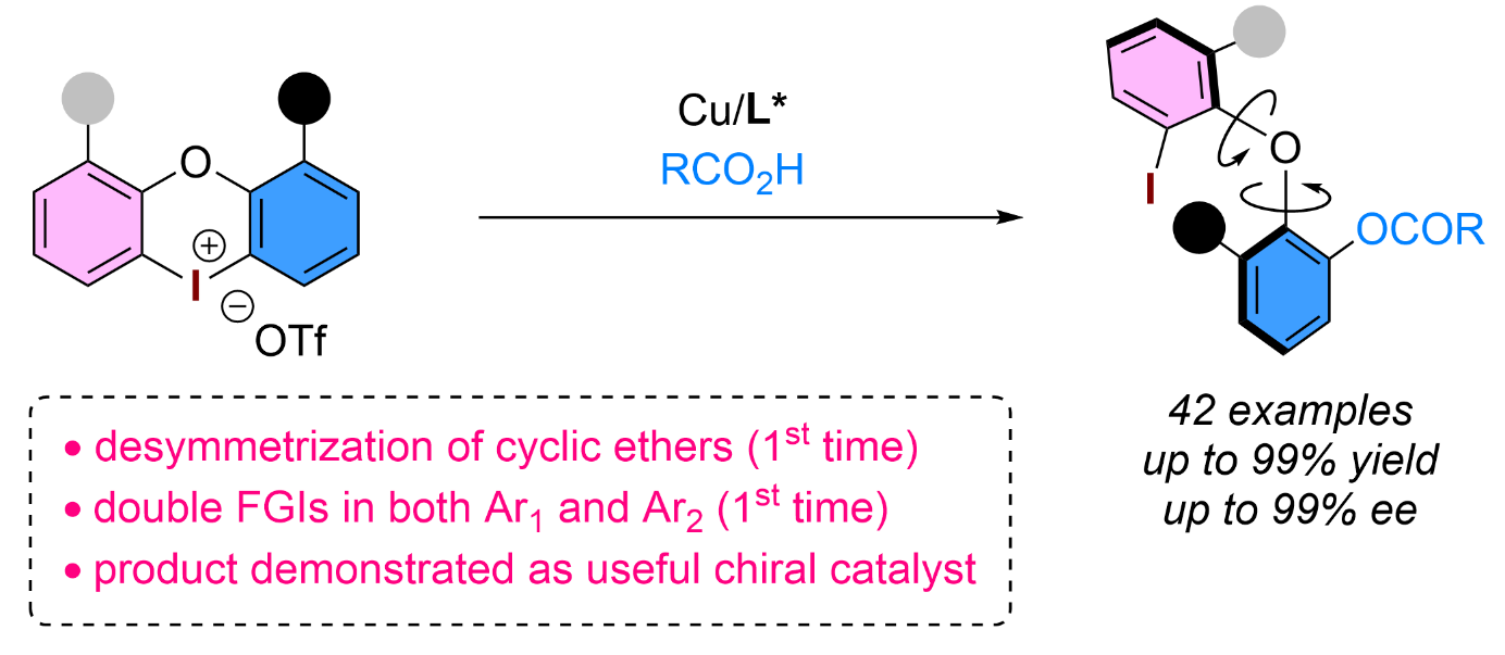 高效構(gòu)建軸向手性二芳基醚(ACDEs)是有機(jī)合成中一項(xiàng)重要且新興但極具挑戰(zhàn)性的任務(wù)?,F(xiàn)有基于去對(duì)稱化策略的成功案例僅限于非環(huán)芳基醚,且僅能對(duì)四個(gè)取代基中的一個(gè)進(jìn)行單一修飾,模塊化程度較低。黃海和孫建偉課題組近日首次開發(fā)了一種雙取代基同步修飾的對(duì)映選擇性合成策略,實(shí)現(xiàn)了ACDEs結(jié)構(gòu)的靈活多樣化構(gòu)建?;诃h(huán)狀二芳基碘鎓鹽的開環(huán)反應(yīng),建立了一種溫和的銅催化方法,在溫和條件下實(shí)現(xiàn)了優(yōu)異的反應(yīng)效率、對(duì)映選擇性和良好的區(qū)域選擇性。所獲得的高對(duì)映體純度ACDEs產(chǎn)物可作為高效手性催化劑應(yīng)用于不對(duì)稱合成領(lǐng)域。