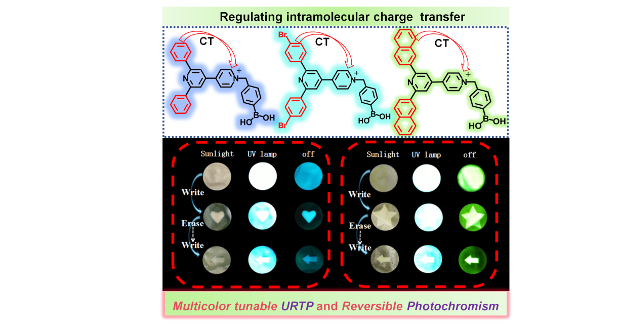 動態(tài)光致變色長壽命室溫磷光材料是一類兼具結(jié)構(gòu)色變化與發(fā)光特性可調(diào)(強度、壽命及顏色)的智能光學(xué)材料,在高級防偽、信息加密、傳感等領(lǐng)域具有巨大應(yīng)用潛能。然而,如何將光致變色和長壽命室溫磷光功能有效整合到單一聚合物體系,以構(gòu)筑出多色可調(diào)的高性能的動態(tài)光致變色長壽命室溫磷光聚合物,仍面臨巨大挑戰(zhàn)。我們研究團隊策略性地將具有可調(diào)控分子內(nèi)電荷轉(zhuǎn)移(ICT)能力的非線性吡啶鎓單元嵌入剛性聚乙烯醇(PVA)基質(zhì)中,成功地開發(fā)了多色可調(diào)的動態(tài)光致變色長壽命室溫磷光聚合物。
