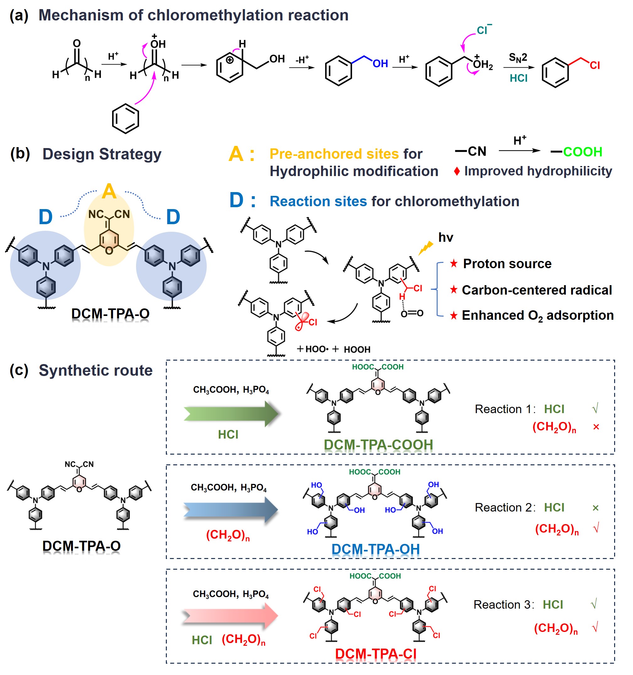 (1)針對(duì)氧氣吸附能力不足的問題,在CMPs材料中通過后修飾反應(yīng)引入吸電子基團(tuán)是解決此問題的好方法(圖1)。在之前的工作中引入磺酸基和季銨鹽(Adv. Funct. Mater.2025, 35, 2415244)的基礎(chǔ)上,我們首次將氯甲基引入CMPs中用于高效生產(chǎn)H2O2。在聚合物催化劑的制備中,氯甲基修飾的聚合物常用作傅-克烷基化等交聯(lián)反應(yīng)的中間體,因其疏水性而未在光催化產(chǎn)H2O2領(lǐng)域引起重視。經(jīng)典的Blanc氯甲基化反應(yīng)常用聚甲醛和鹽酸為氯甲基化試劑,磷酸或冰醋酸等為縮合劑?;诖耍覀?cè)诓牧显O(shè)計(jì)中以三苯胺為反應(yīng)位點(diǎn),以氰根為酸化位點(diǎn),通過一步氯甲基化反應(yīng),同時(shí)引入氯甲基和羧基,分別用于增強(qiáng)氧氣吸附和改善親水性。經(jīng)氯甲基修飾的CMPs在純水和空氣中的產(chǎn)H2O2速率達(dá)到5.0 mmol g-1 h-1,在氧氣氛圍中的性能僅增長1.8%,證明其氧氣吸附能力之強(qiáng)。而在苯甲醇和水的混合溶劑中性能更是達(dá)到了38.0 mmol g-1 h-1,超過大多數(shù)目前已報(bào)到的催化劑。該工作以Chloromethylation modified pyranonitrile-based conjugated microporous polymers for selective one-step two-electron O2 reduction to H2O2為題,發(fā)表在化學(xué)領(lǐng)域頂級(jí)期刊Angew. Chem. Int. Ed.2025, 64, e202508436。