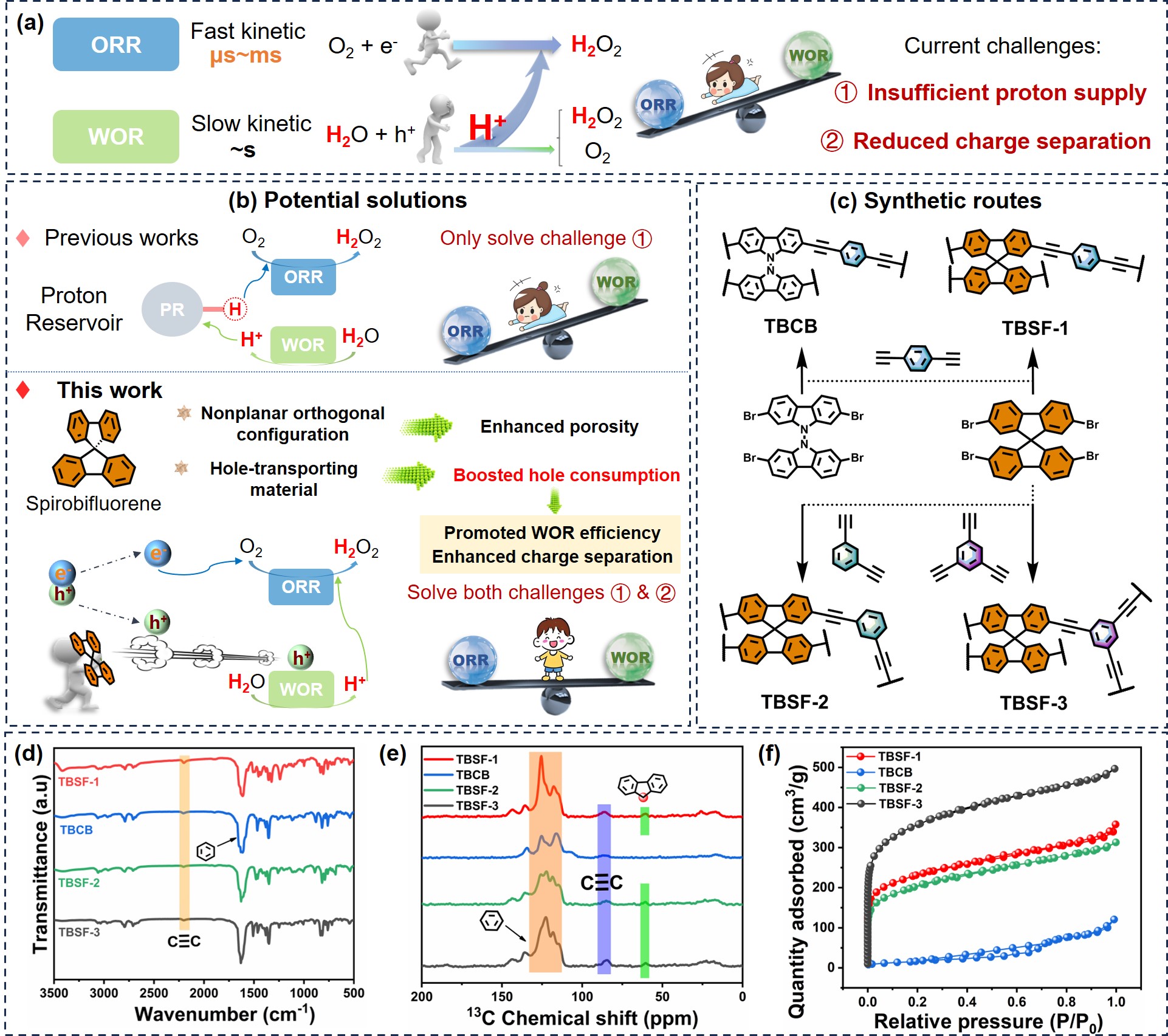 (2)針對(duì)質(zhì)子供應(yīng)有限的問題,我們?cè)谥暗墓ぷ髦校?/span>Chem, Sci.2025, 16, 8577-8587)提出“質(zhì)子海綿”的概念,直接給氧還原反應(yīng)(ORR)供質(zhì)子,來解決“質(zhì)子悖論”問題。但該策略并未有效抑制光生載流子的復(fù)合和提高電荷傳輸能力。為此,我們提出直接提高水氧化反應(yīng)(WOR)性能的策略,以螺二芴分子為構(gòu)筑單元合成COPs催化劑(圖2)。螺二芴具有正交的空間構(gòu)型,是高效的空穴傳輸材料,基于其的COPs具有諸多優(yōu)點(diǎn),例如WOR性能大幅度提高以產(chǎn)生更多質(zhì)子,滿足ORR較快的動(dòng)力學(xué)需求;加速空穴消耗,抑制載流子復(fù)合;獨(dú)特的正交電荷傳輸通道更是加速了電荷的傳輸。因此,這類COPs催化劑在純水和空氣中的產(chǎn)H2O2速率達(dá)到9.29 mmol g-1 h-1,在氮?dú)夥諊幸材苓_(dá)到3.28 mmol g-1 h-1。該工作以Orthogonal Configurative Spirobifluorene-Based Conjugated Organic Polymers for Enhanced Water Oxidation Reaction to Boost H2O2 Photosynthesis為題,發(fā)表在材料學(xué)領(lǐng)域頂級(jí)期刊Adv. Funct. Mater.2025, e18050。