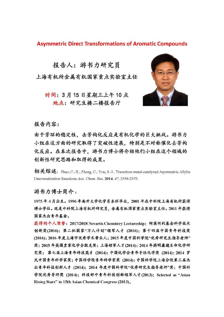 【講座】3月15日學(xué)術(shù)報告--游書力研究員(上海有機所)