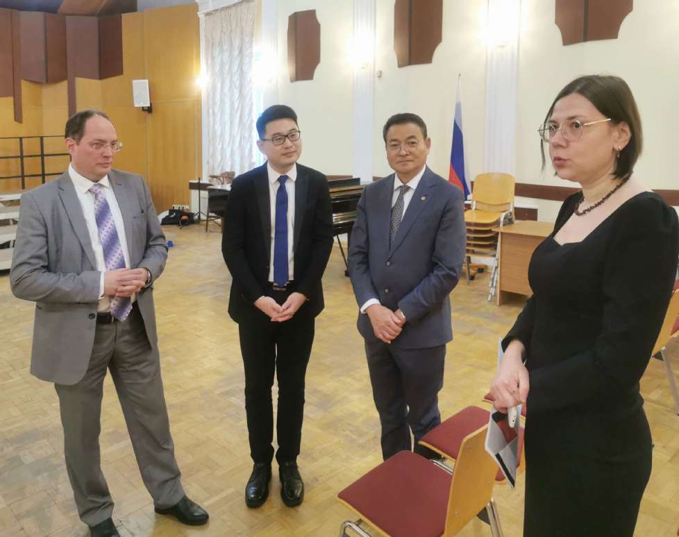 訪問莫斯科國立柴可夫斯基音樂學(xué)院期間,我校代表團與校長亞歷山大·索科洛夫,學(xué)校教育教學(xué)高級顧問、原第一副校長拉麗莎·斯盧茨卡婭,分管國際事務(wù)副校長瑪格麗特·庫拉德金娜進行會見,簽訂了兩校聯(lián)合博士人才培養(yǎng)、共建高水平國際音樂節(jié)、大師班、高水平藝術(shù)實踐、共建科研團隊等全面合作協(xié)議。會后,代表團參觀了學(xué)校著名的法因貝格和涅高茲鋼琴教室、大小音樂廳及著名音樂家雕像陳列室。