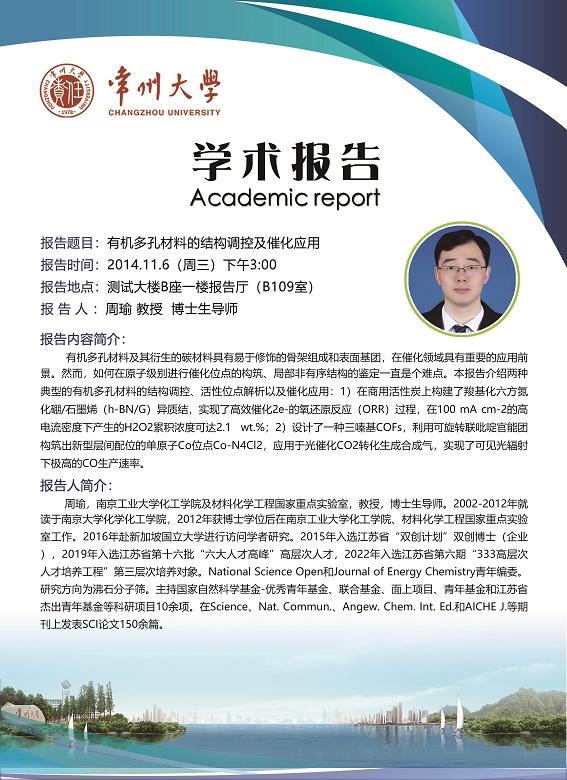 | 【學(xué)術(shù)報告】11月6日學(xué)術(shù)報告—王軍教授、周瑜教授 南京工業(yè)大學(xué) |