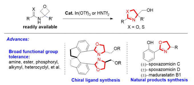 A Mild Catalytic Synthesis of 2-Oxazolines via Oxetane Ring-Opening: Rapid Access to A Diverse Family of Natural Products Hai Huang,Wen Yang,Zuliang Chen,Zengwei Laiand Jianwei Sun* 近日,孫建偉和黃海教師課題組在化學(xué)國際頂級刊物Chemical Science上發(fā)表題為“A Mild Catalytic Synthesis of 2-Oxazolines via Oxetane Ring-Opening: Rapid Access to A Diverse Family of Natural Products”的研究論文。論文通訊聯(lián)系人為孫建偉教授,第一作者為石油化工學(xué)院新進(jìn)青年教師黃海博士。噁唑啉類化合物在生物活性分子以及金屬配體中都有廣泛的應(yīng)用。關(guān)于該類化合物的合成目前只能依賴于非催化地胺基醇或者N-烯丙基甲酰胺類化合物的環(huán)合反應(yīng)。該工作巧妙地將甲酰胺鍵引入到氧雜環(huán)丁烷分子中從而實現(xiàn)其分子內(nèi)開環(huán)反應(yīng)。該方法發(fā)展了一種催化合成噁唑啉環(huán)的方法,同時兼具條件溫和、高效性、優(yōu)越的官能團(tuán)容忍性等優(yōu)點。通過該方法不僅能夠?qū)崿F(xiàn)新型手性配體地合成,同時能夠快速地合成系列天然產(chǎn)物包括(±)-Spoxazomicin C, (±)-Madurastatin B1和(±)-Spoxazomicin D。 Chemical Science是是英國皇家化學(xué)會(RSC)旗艦刊物,2019年影響因子為9.556。中科院分區(qū)為一區(qū),TOP及Nature Index刊物。該期刊發(fā)表綜合化學(xué)領(lǐng)域的高水平論文,致力于為化學(xué)領(lǐng)域研究人員的學(xué)術(shù)觀點和學(xué)術(shù)信息交流提供一個國際化、高質(zhì)量的學(xué)術(shù)交流期刊平臺。