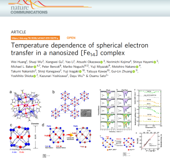 近日,我校石油化工學(xué)院吳大雨教授團(tuán)隊(duì)在合成和表征新型無(wú)機(jī)納米團(tuán)簇及其電子行為研究方面取得重要進(jìn)展,在Nature Communications(自然通訊)發(fā)表了題為“Temperature dependence of spherical electron transfer in a nanosized [Fe14] complex”(DOI: 10.1038/s41467-019-13279-y)的原創(chuàng)性論文(文章鏈接:https://www.nature.com/articles/s41467-019-13279-y)。Nature Communications期刊是Nature出版集團(tuán)旗下的國(guó)際頂級(jí)綜合性學(xué)術(shù)期刊,該項(xiàng)成果以常州大學(xué)為第一署名單位。近年來(lái),吳大雨教授課題組致力于分子基材料跨學(xué)科研究,所涉及的學(xué)科方向包括化學(xué)、材料學(xué)、物理學(xué)與光電子等。該項(xiàng)工作應(yīng)用金屬-有機(jī)自組裝策略,合成了高核鐵原子納米團(tuán)簇,通過(guò)精準(zhǔn)調(diào)控團(tuán)簇表面的自由電子觀(guān)察分子水平上多電子轉(zhuǎn)移,顯示出分子基材料在電子轉(zhuǎn)移活性催化材料、單分子磁體、高密度信息存儲(chǔ)等領(lǐng)域的巨大應(yīng)用潛力。其亮點(diǎn)不僅在于成功合成氰橋高核鐵納米團(tuán)簇,同時(shí)結(jié)合多種表征方法和理論計(jì)算清晰表征團(tuán)簇球殼表面的電子轉(zhuǎn)移活性位點(diǎn),其作為電子化合物屬性是一類(lèi)具有特殊性能的量子材料,其中過(guò)剩電子被限域在團(tuán)簇殼層表面并充當(dāng)陰離子,對(duì)電子傳輸和材料的催化、電磁等性能起關(guān)鍵作用。