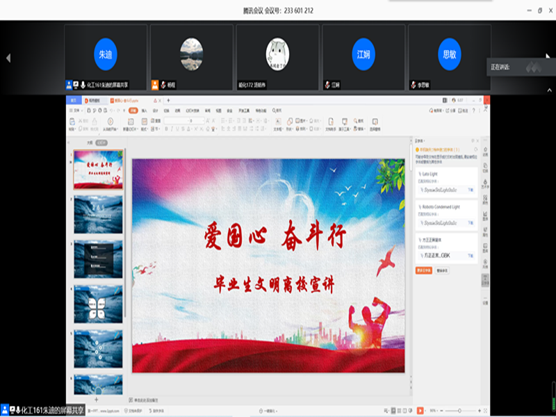 學(xué)院精心為每位畢業(yè)生制作畢業(yè)紀(jì)念優(yōu)盤,表達(dá)學(xué)院對畢業(yè)生的殷殷期盼,望石化學(xué)子奔涌前行;畢業(yè)學(xué)子創(chuàng)作畢業(yè)歌曲《化說再見》,記錄別樣青春時光;畢業(yè)典禮嚴(yán)肅活潑,讓畢業(yè)生擁有難忘且珍貴的記憶;考研宿舍感恩活動傳遞正能量,難忘宿管阿姨、食堂阿姨的關(guān)懷照顧;畢業(yè)班會憶往昔話今朝,師生情深,不說再見;考研學(xué)霸班級勵志成長,激勵石化學(xué)子乘風(fēng)破浪;“青年講師團(tuán)”畢業(yè)文明離校宣講活動,傳遞愛國情,砥礪奮斗行;誠信教育線上活動,學(xué)生感恩資助,自立自強(qiáng);畢業(yè)班黨員學(xué)習(xí)經(jīng)驗分享,不忘初心,揚(yáng)帆遠(yuǎn)航;考研經(jīng)驗交流,站在學(xué)長學(xué)姐的肩膀,逐夢前行。
