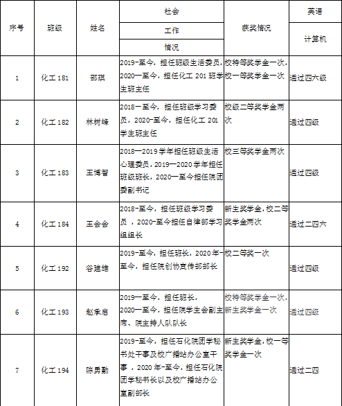 根據(jù)我校發(fā)展學生黨員公示制的有關規(guī)定,經(jīng)石油化工學院食品學院第一學生黨支部討論決定和石油化工學院食品學院黨委審議,擬發(fā)展下列同志為中共預備黨員。現(xiàn)將基本情況公示如下: