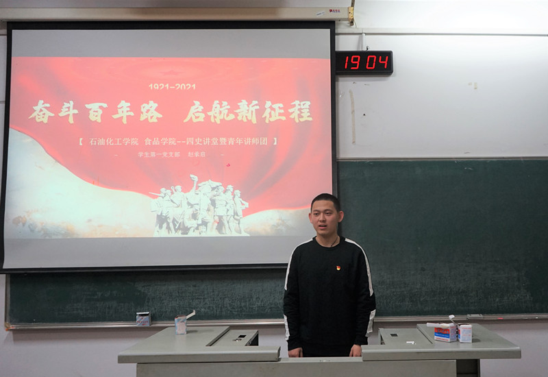 趙承啟以回顧歷史開(kāi)始,以黨史發(fā)展脈絡(luò)為切入點(diǎn),穿插講述共產(chǎn)黨人為國(guó)捐軀的事跡以及不忘使命的精神。最后講述了自身的經(jīng)歷與對(duì)黨史的感悟。