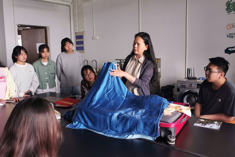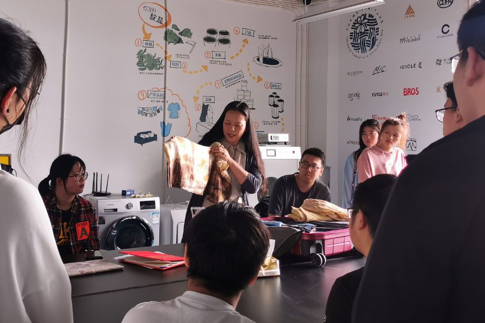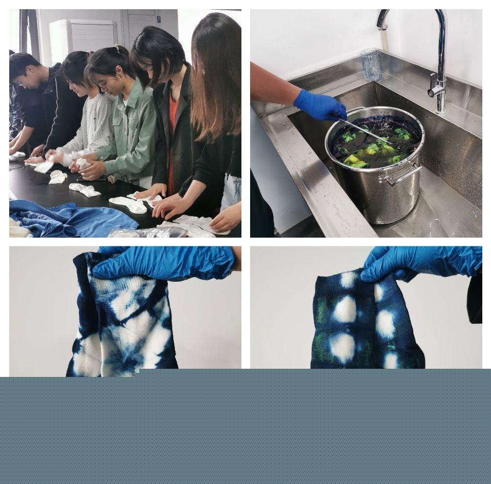紀(jì)老師首先為同學(xué)們介紹了植物染的原料和原理,邊講解邊展示通過不同原料和印染方式得到的各種作品,讓同學(xué)們直觀地認(rèn)識植物染。接著進(jìn)行互動(dòng)提問,同學(xué)們對不同面料染色度、植物染料與合成染料的結(jié)構(gòu)、植物染提取過程中的助劑等提出疑問,紀(jì)老師一一進(jìn)行了解答。最后同學(xué)們動(dòng)手體驗(yàn)扎染,將布料浸濕后折疊捆扎,然后浸入色漿進(jìn)行染色,創(chuàng)作出屬于自己獨(dú)一無二的植物染作品。