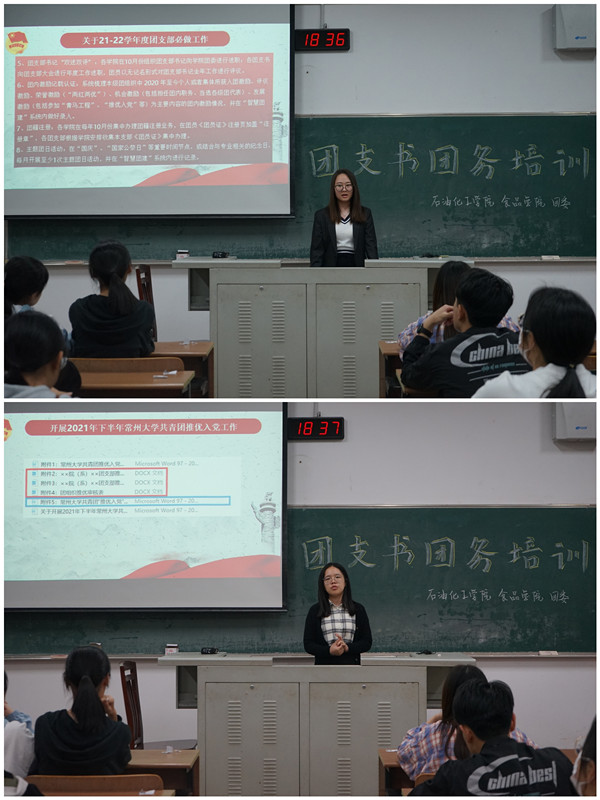 院團(tuán)委書記孫潘老師從思想建設(shè)方面講述了共青團(tuán)工作的重要性,指出各團(tuán)支部應(yīng)從信仰公開課入手加強(qiáng)團(tuán)員思想教育,做好團(tuán)員發(fā)展與后續(xù)教育工作,加強(qiáng)團(tuán)支部建設(shè),提升團(tuán)支部凝聚力。副書記許涵僑同學(xué)對“雙述雙評”、“團(tuán)日活動(dòng)”、“黨史學(xué)習(xí)會(huì)”的開展進(jìn)行了具體培訓(xùn),并對下半年推優(yōu)工作進(jìn)行了具體布置。