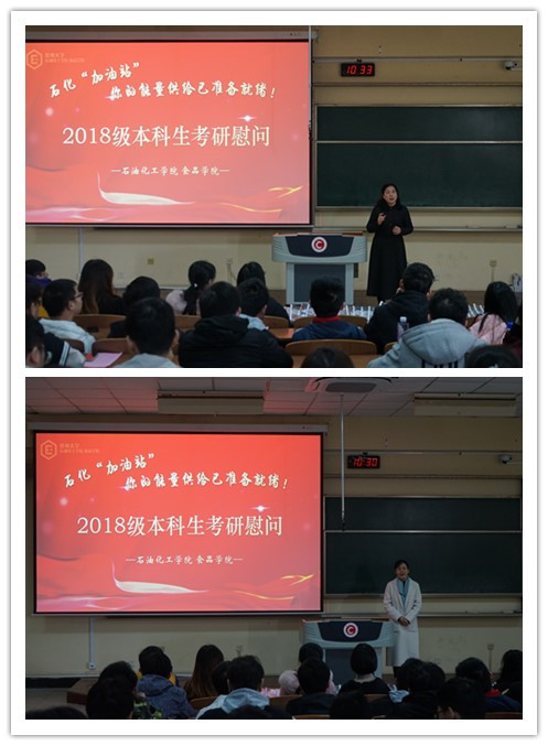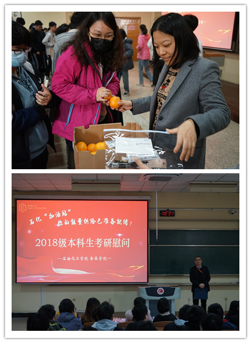 管春英結(jié)合自身求學(xué)經(jīng)歷激勵(lì)考生們?cè)谧詈鬀_刺階段靜心聚力,以必勝的信念迎接挑戰(zhàn);鐘璟悉心詢問了各位考研學(xué)子的復(fù)習(xí)進(jìn)度和心理狀態(tài),并給予針對(duì)性的意見;宣慧勉勵(lì)大家“一‘研’為定,明年一定研一”,踏上更高的平臺(tái),迎接新的挑戰(zhàn);劉文杰對(duì)考研學(xué)子的執(zhí)著追夢(mèng)精神表示肯定,并指出考研是提高學(xué)業(yè)水平的重要途徑,對(duì)未來發(fā)展起重要作用。最后,學(xué)院還為考研學(xué)子們發(fā)放石化“加油卡”、石化“加油包”、石化“加油橙”,祝愿所有考研學(xué)子心想事成,馬到成功!