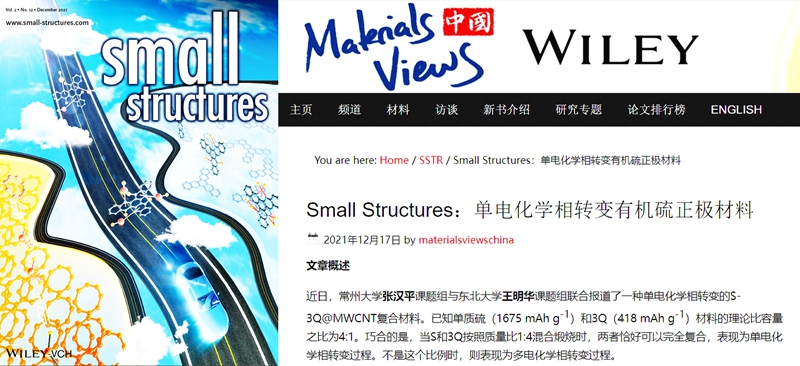 課題組與東北大學(xué)王明華教授合作的相關(guān)論文近日作為封面文章(Inside front cover)在Wiley新刊Small Structures上發(fā)表,并在12月17日Materials Views - China首頁進(jìn)行了詳細(xì)報道。論文第一作者為常州大學(xué)碩士研究生何志鵬。