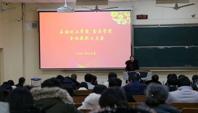 2021年12月30日,石油化工學(xué)院 食品學(xué)院分工會召開全院教職工大會。會議總結(jié)了學(xué)院2021年的整體工作,著重就學(xué)期末、假期中、開學(xué)初的重點工作做了部署。正值2021歲末,學(xué)院領(lǐng)導(dǎo)為全院職工帶來祝福,祝愿新的一年大家共同努力、共同進(jìn)步!