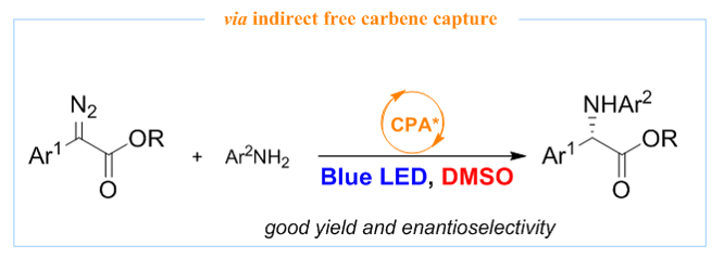 解決方案:如何抑制背景反應(yīng)以提高有機(jī)催化的自由卡賓轉(zhuǎn)移反應(yīng)的立體選擇性,是該研究體系所面臨的最重要的科學(xué)問題與挑戰(zhàn)?;谖覀冋n題組在有機(jī)催化的卡賓類似物(硫葉立德)N-H插入反應(yīng)的研究興趣,我們首先研究了有機(jī)催化的可見光介導(dǎo)條件下的自由卡賓不對稱N-H插入反應(yīng),通過適當(dāng)?shù)姆磻?yīng)條件優(yōu)化,我們發(fā)現(xiàn)在手性磷酸催化劑存在下,反應(yīng)最高只能獲得具有中等的立體選擇性的N-H插入產(chǎn)物?;诖饲捌谘芯拷Y(jié)果,我們設(shè)想能否通過自由卡賓的間接捕獲思路,即利用含孤對電子的化合物作為添加劑捕獲可見光激發(fā)產(chǎn)生的自由卡賓而原位形成新的葉立德中間體,該葉立德中間體需順利參與手性酸催化的不對稱N-H插入反應(yīng),從而提高反應(yīng)的立體選擇性(思路見下圖)。但此思路中,各步反應(yīng)速率的匹配性以及添加劑與催化反應(yīng)體系的兼容性是需要額外考慮的問題。