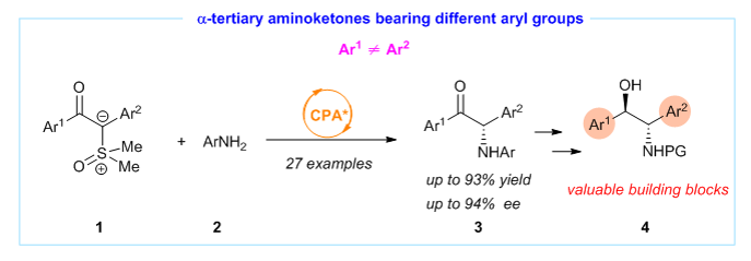 在進(jìn)行上述卡賓捕獲反應(yīng)時,我們發(fā)現(xiàn)之前從未應(yīng)用于不對稱催化反應(yīng)的兩側(cè)含芳基取代的氧化硫葉立德1在手性酸催化下可順利進(jìn)行N-H插入反應(yīng)而獲得alpha-氨基酮3,文獻(xiàn)中已報道的該類型alpha-氨基酮的有效的不對稱催化合成方法很少,究其原因在于手性中心的不穩(wěn)定?;诖?,我們通過手性磷酸催化的氧化硫葉立德的不對稱N-H插入反應(yīng)實現(xiàn)了該類氨基酮的不對稱催化合成。我們的方法尤其適合于合成含不同芳基取代基的alpha-氨基酮3,其在藥物合成,配體設(shè)計,手性輔基設(shè)計等領(lǐng)域具有重要的應(yīng)用價值。