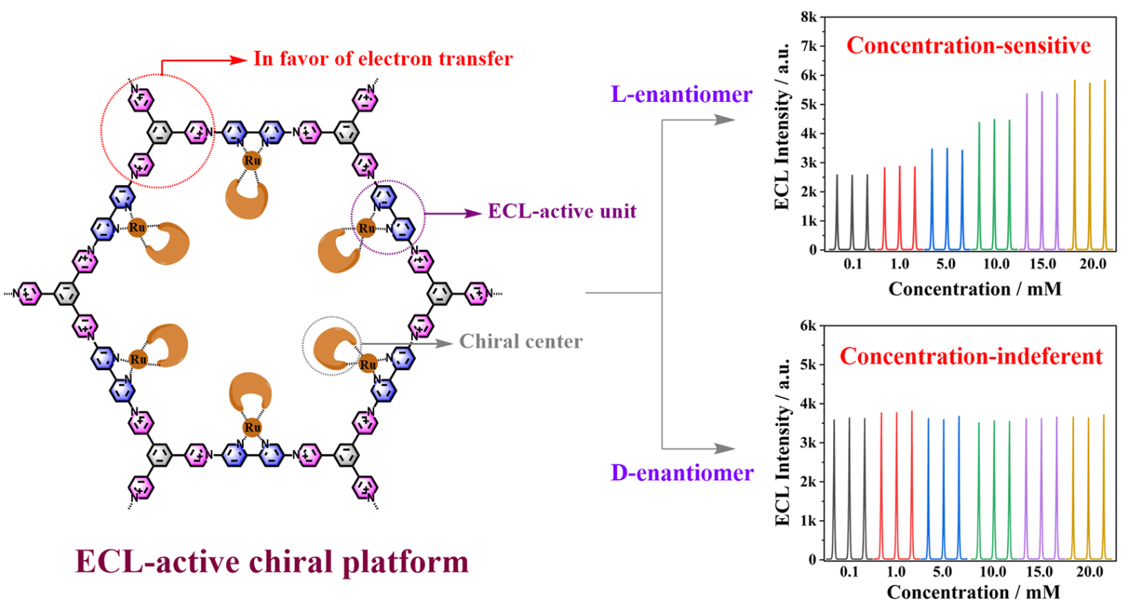 具有優(yōu)異光電性能的手性材料在對映體識別中有著極大地應(yīng)用潛力。近年來,孔泳教授團隊的吳大同副教授基于離子型手性分子構(gòu)建了一系列具有電化學(xué)、電致化學(xué)發(fā)光、圓二色譜以及熒光光譜等響應(yīng)的手性識別載體: