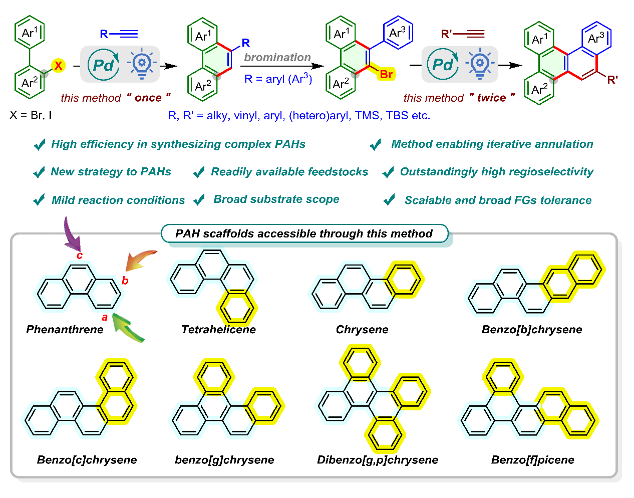 多環(huán)芳烴(PAHs)因其獨特的π-共軛結(jié)構(gòu),在有機電子學(xué)、光電器件和藥物化學(xué)中扮演著關(guān)鍵角色。從OLED顯示器中的發(fā)光材料,到潛在的超導(dǎo)分子,再到天然產(chǎn)物中的活性骨架,PAHs的分子結(jié)構(gòu)直接決定了它們的功能表現(xiàn)。然而,傳統(tǒng)合成方法往往依賴高溫、多步反應(yīng)或貴金屬催化,不僅效率低、成本高,還常因副反應(yīng)多而難以精準(zhǔn)控制分子結(jié)構(gòu)。尤其當(dāng)需要構(gòu)建復(fù)雜、擴展型PAH骨架時,化學(xué)家們面臨“步驟多、產(chǎn)率低、選擇性差”的三重困境。因此,開發(fā)一種步驟簡潔、條件溫和、可模塊化拓展的新策略,成為材料化學(xué)與合成化學(xué)共同亟待突破的科學(xué)問題。