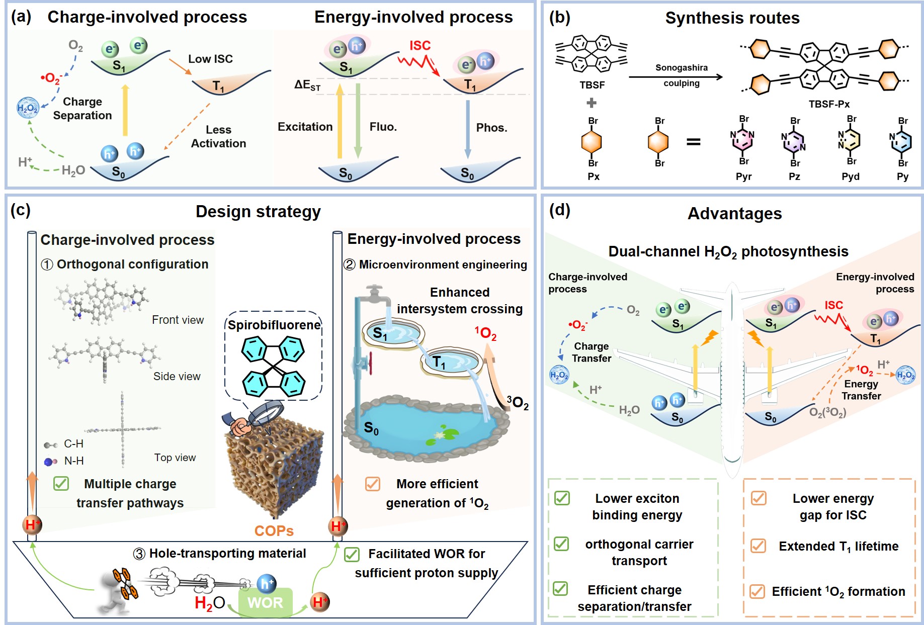 (3)針對(duì)能量路徑較弱的問題,我們探索了將傳統(tǒng)的電荷路徑與能量路徑耦合的策略。能量路徑是指以單線態(tài)氧(1O2)為關(guān)鍵中間體生產(chǎn)H2O2,1O2主要由三線態(tài)氧(3O2)產(chǎn)生,此過程涉及從三重激發(fā)態(tài)(T1)回到基態(tài)(S0)的能量轉(zhuǎn)移。目前大多數(shù)催化劑的T1壽命較短,難以穩(wěn)定存在,這是能量路徑研究較少的主要原因。為此,我們繼續(xù)以螺二芴為結(jié)構(gòu)單元,通過交聯(lián)劑的微環(huán)境調(diào)控制備一系列COPs催化劑,提高其電荷和能量雙路徑的性能(圖3)。其優(yōu)點(diǎn)包括:在電荷路徑,降低了激子結(jié)合能,提高電荷分離效率,通過正交通道增強(qiáng)電荷傳輸;在能量路徑,降低了從單重激發(fā)態(tài)(S1)到T1的能壘,加速系間竄躍,延長T1壽命,從而提高生產(chǎn)1O2的效率。優(yōu)化后的COPs催化劑在在純水和空氣中的產(chǎn)H2O2速率達(dá)到7.21 mmol g-1 h-1,太陽能-化學(xué)能轉(zhuǎn)化效率更是高達(dá)1.88%。該類催化劑在三相漂浮體系、太陽光照實(shí)驗(yàn)、連續(xù)流實(shí)驗(yàn)和滅菌實(shí)驗(yàn)中均取得了較好的性能。該工作以Achieve a simultaneous charge- and energy-involved dual-channel mechanism in spirobifluorene-based conjugated organic polymers for enhanced H2O2 photosynthesis為題發(fā)表在化學(xué)領(lǐng)域頂級(jí)期刊J. Am. Chem. Soc.2025, DOI: 10.1021/jacs.5c16544.