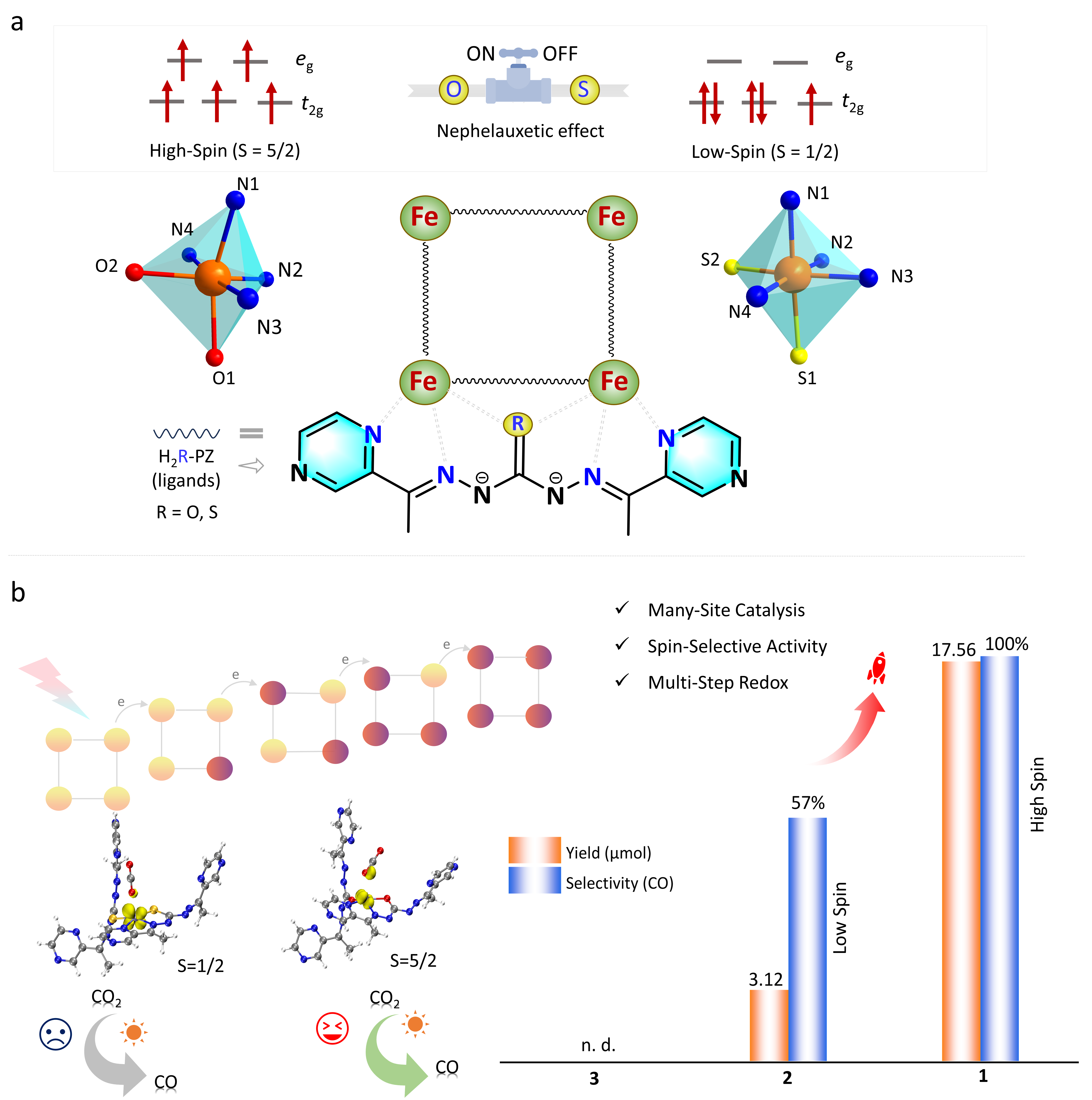 課題組針對催化中心自旋態(tài)在原子尺度上的精準(zhǔn)調(diào)控難題,提出了一種超分子自組裝新策略:通過構(gòu)建基于π?π堆積的長程有序結(jié)構(gòu),并巧妙利用配體的Nephelauxetic 效應(yīng),僅通過替換單個(gè)橋原子即實(shí)現(xiàn)了Fe3+中心在高自旋與低自旋態(tài)之間的可控切換,成功制備了自旋態(tài)可調(diào)的Fe4團(tuán)簇超薄納米層(圖2)。研究表明,高自旋態(tài)Fe3+團(tuán)簇具有更優(yōu)異的電子轉(zhuǎn)移能力,可顯著促進(jìn)光生載流子分離與傳輸,在CO2還原反應(yīng)中表現(xiàn)出接近100%的CO選擇性及遠(yuǎn)優(yōu)于低自旋體系的催化活性。理論計(jì)算進(jìn)一步闡明,高自旋態(tài)Fe3+與CO2之間存在更強(qiáng)的軌道相互作用,不僅能增強(qiáng)CO2吸附,還可降低關(guān)鍵中間體形成的吉布斯自由能。該工作不僅為設(shè)計(jì)具有自旋調(diào)控功能的CO2光還原催化劑提供了新穎的超結(jié)構(gòu)模型,也深化了對自旋態(tài)影響人工光合作用過程機(jī)制的認(rèn)識(shí)。