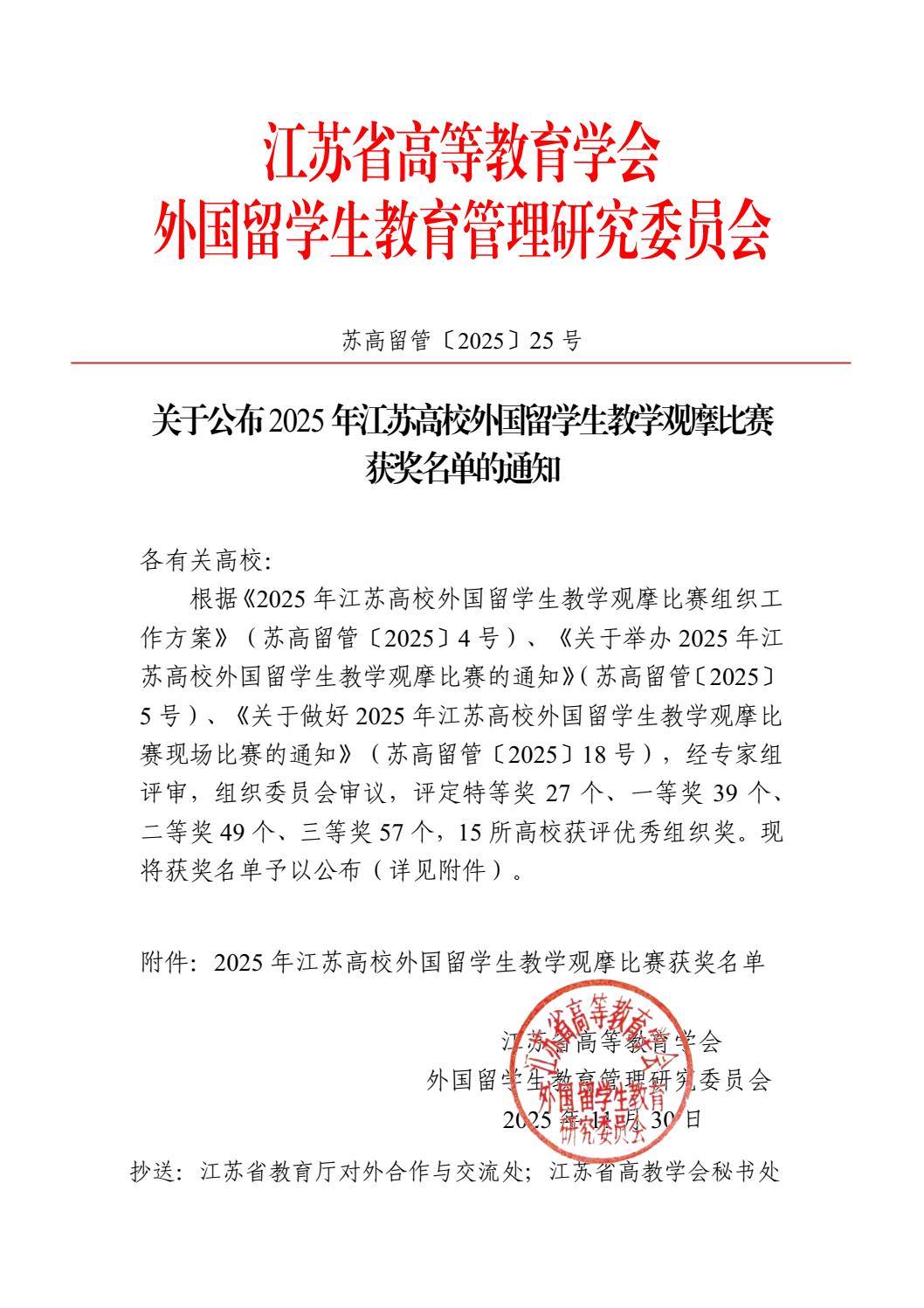 近日,江蘇省高等教育學(xué)會(huì)外國留學(xué)生教育管理研究委員會(huì)公布了2025年江蘇高校外國留學(xué)生教學(xué)觀摩比賽獲獎(jiǎng)名單。經(jīng)過專家組評審和組織委員會(huì)審議,我院有機(jī)化學(xué)教研室滕巧巧老師榮獲三等獎(jiǎng)。