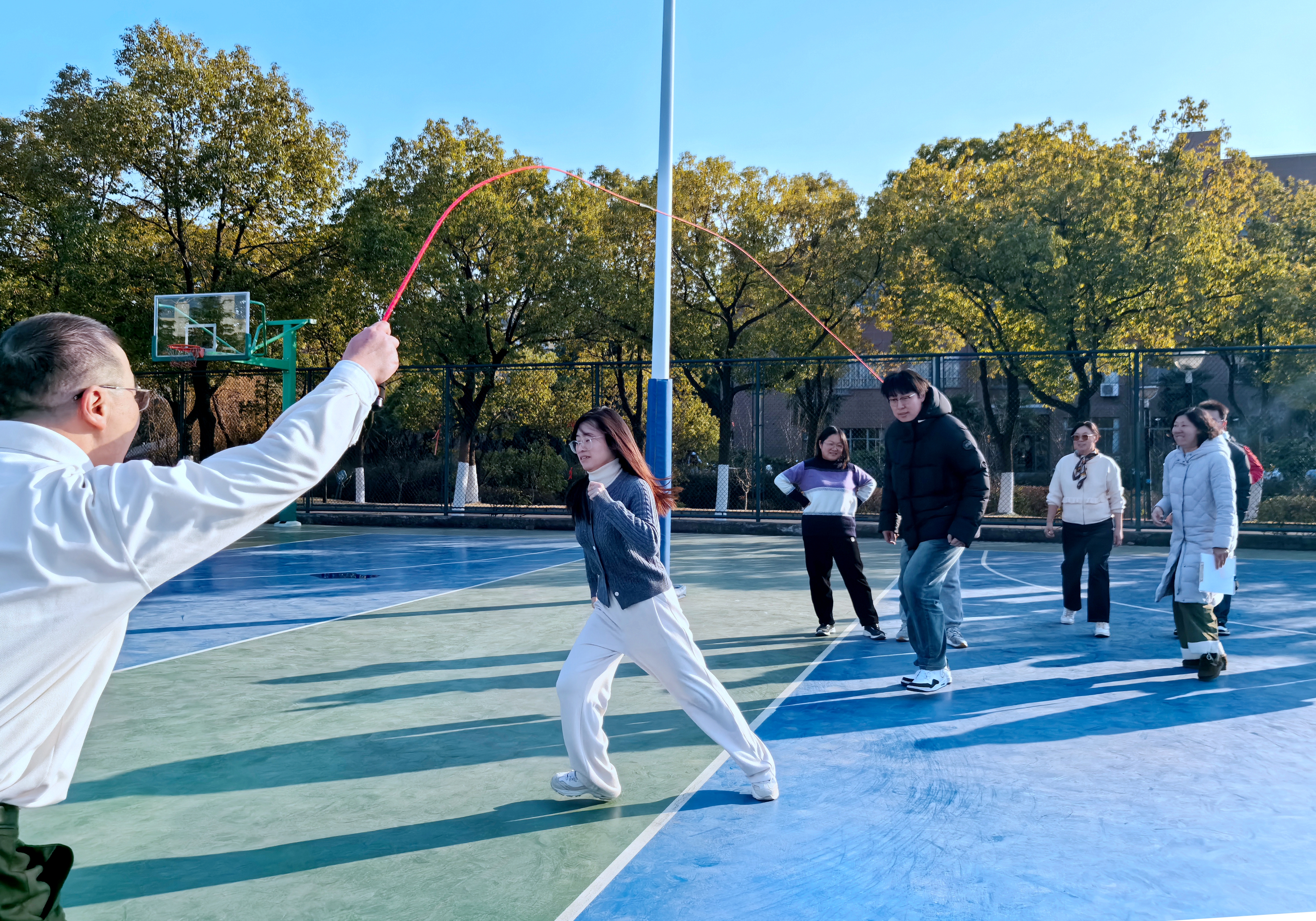 比賽現(xiàn)場氣氛熱烈,歡聲笑語不斷,老師們踴躍組隊參與配合默契,長繩翻飛,身姿躍動,現(xiàn)場的加油聲、歡呼聲交織一片,驅散了冬日的寒意,充分展現(xiàn)了學院教職工昂揚向上的精神風貌。