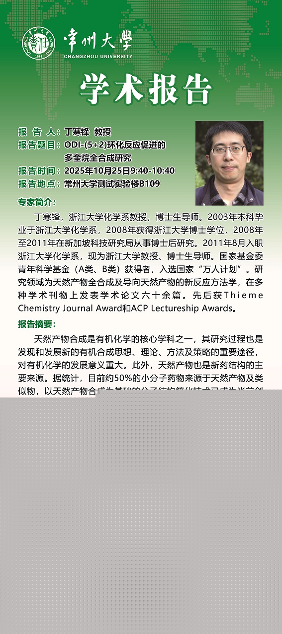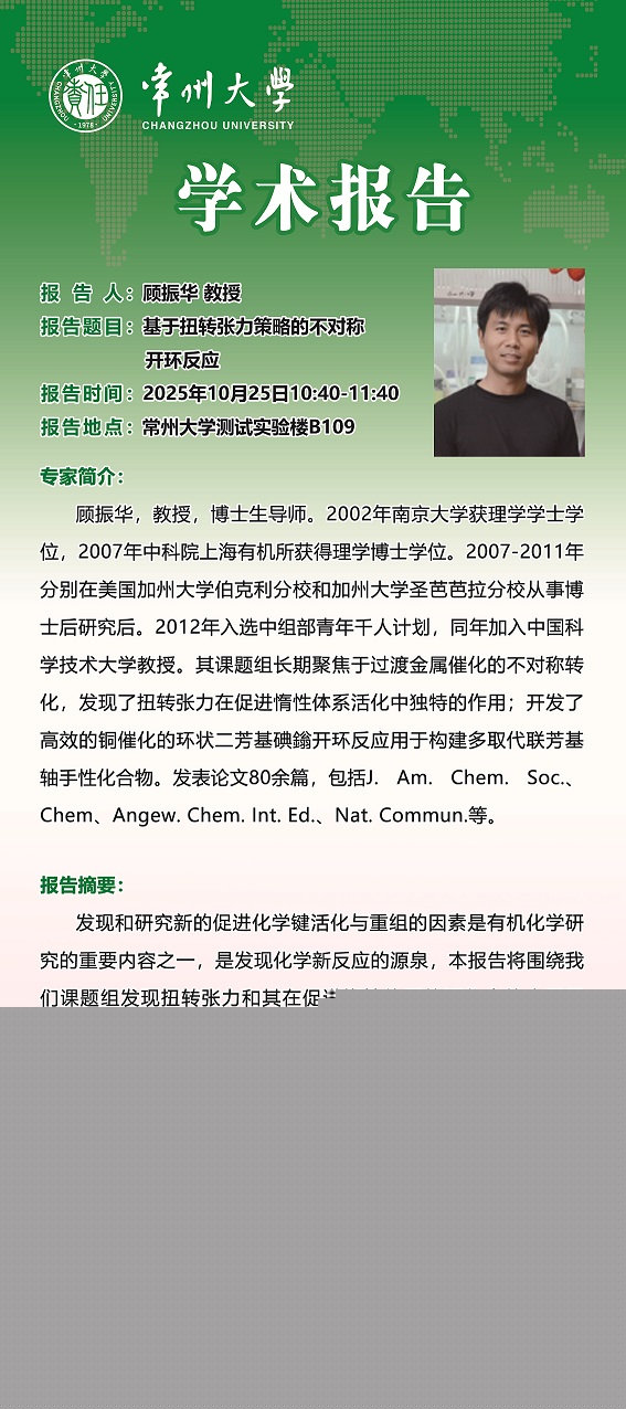 | 【學術報告】10月25日功能雜環(huán)研究院學術報告——丁寒鋒教授 浙江大學 顧振華教授 中國科學技術大學 |