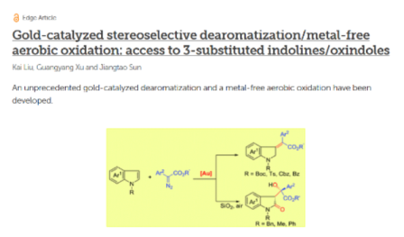 近日,石油化工學(xué)院孫江濤教授課題組在化學(xué)頂級期刊《Chemical Science》上發(fā)表題為“Gold-catalyzed stereoselective dearomatization/metal-free aerobic oxidation: access to 3-substituted indolines/oxindoles”的通訊文章,這是我校在此期刊上發(fā)表的第一篇通訊論文。Chemical Science是英國皇家化學(xué)會(the Royal Society of Chemistry)的旗艦期刊,報(bào)道化學(xué)學(xué)科原創(chuàng)性研究成果,是化學(xué)綜合領(lǐng)域最有影響力的三大期刊之一,也是國際上衡量科研小組研究水平的重要標(biāo)志性期刊。