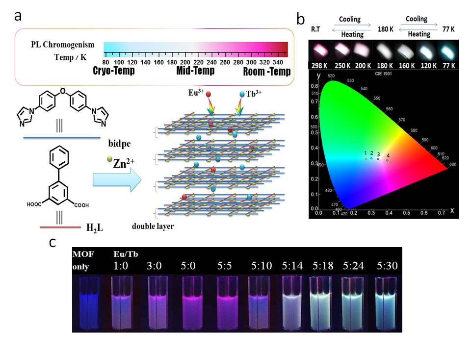 Tuning the Solid-State White Light Emission of Postsynthetic Lanthanide-Encapsulated Double-Layer MOFs for Three-Color Luminescent Thermometry Applications Liya Qiu?, Chengfeng Yu?, Xiaoling Wang?, Yangbin Xie?, Alexander M. Kirillov?§, Wei Huang*?, Jipeng Li?, Peng Gao?, Ting Wu?, Xiangwei Gu?, Qi Nie?, and Dayu Wu*? ? Jiangsu Key Laboratory of Advanced Catalytic Materials and Technology, Advanced Catalysis and Green Manufacturing Collaborative Innovation Center, School of Petrochemical Engineering, Changzhou University, Changzhou, Jiangsu213164, People’s Republic of China. ? Centro de Quimica Estrutural, Instituto Superior Tecnico, Universidade de Lisboa, Av. Rovisco Pais, 1049-001 Lisbon, Portugal. § Peoples’ Friendship University of Russia (RUDN University), 6 Miklukho-Maklayast., Moscow 117198, Russian Federation. 近日,吳大雨課題組通過后修飾方法成功合成了一例稀土嵌入二維雙層金屬有機框架(MOF)晶態(tài)材料,通過精準調(diào)控稀土離子的摻雜比例,實現(xiàn)了MOF材料的全彩色指紋發(fā)光。這類二維材料展現(xiàn)出優(yōu)良的溫度傳感功能,對溫度變化反應靈敏、可逆切換。有望應用在寬溫區(qū)(幾K到670 K)以及極端環(huán)境下的溫度計領(lǐng)域。 原文鏈接:https://pubs.acs.org.ccindex.cn/doi/pdf/10.1021/acs.inorgchem.9b00084.
